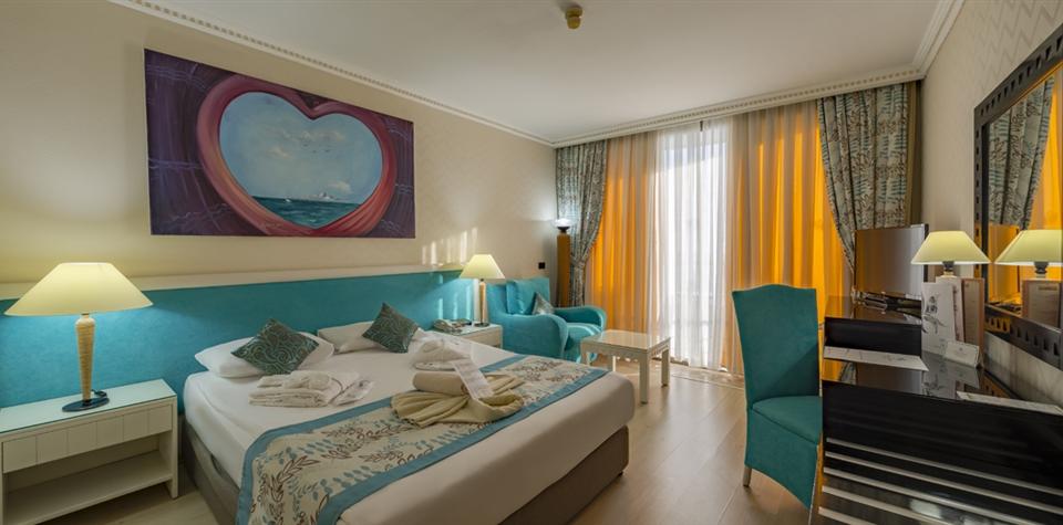 * Deluxe Teras Odaları: 28 m² genişliğindedir. Toplam 55 adettir. Geniş balkonludur ve balkonda şezlong vardır. Standart odaların tüm özellikleri ve bornoz mevcuttur. Zemin laminant parke ile kaplıdır ve banyolarında birbirinden bağımsız küvet ve duş bulunmaktadır. Odada çay ve kahve yapmak için gerekli ekipman mevcuttur. (9 adet balayı odası bulunmaktadır)