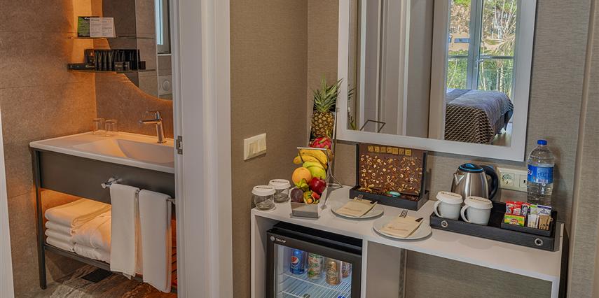 * Mini bar ücretsiz olup, günlük su ve girişte soft içecekler ile doldurulmaktadır.
