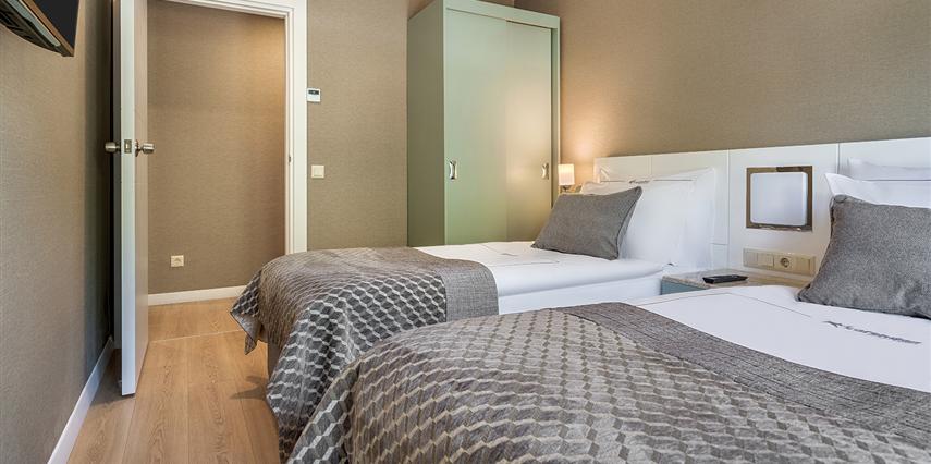 * Suit Oda, : 40 m² genişliğinde, 1 French Bed + 1 Sofa Bed. 1 Banyo (Küvet / Wc). Maksimum 4 kişi kapasiteli. Kara manzaralı. Seramik zemin. Annex Binada. French Balkonlu.