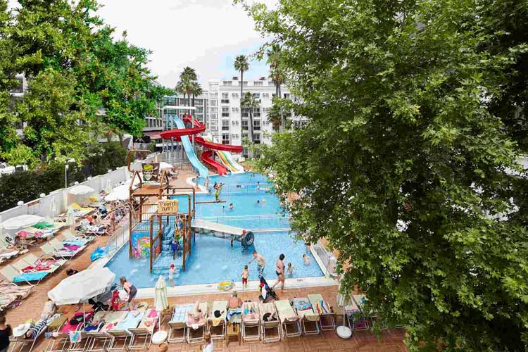 2 Açık yüzme havuzu, 1 Kapalı yüzme havuzu, 1 çocuk havuzu ve 3 su kaydırağı bulunmaktadır. Tesis, denize sıfır konumda bulunmaktadır. Tesisin havuz ve plajında şezlong, şemsiye ve havlu ücretsiz olarak sağlanmaktadır.
