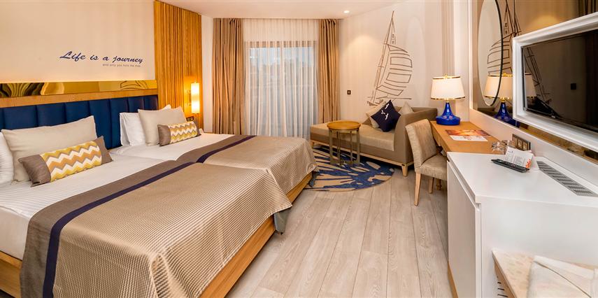 * Standart Odaları: Bir çift kişilik yatak, sofa veya iki tek kişilik yatak, sofa mevcuttur. 28 m² genişliğindedir. Max. 2/2+1 kişilik konaklamaya uygundur.